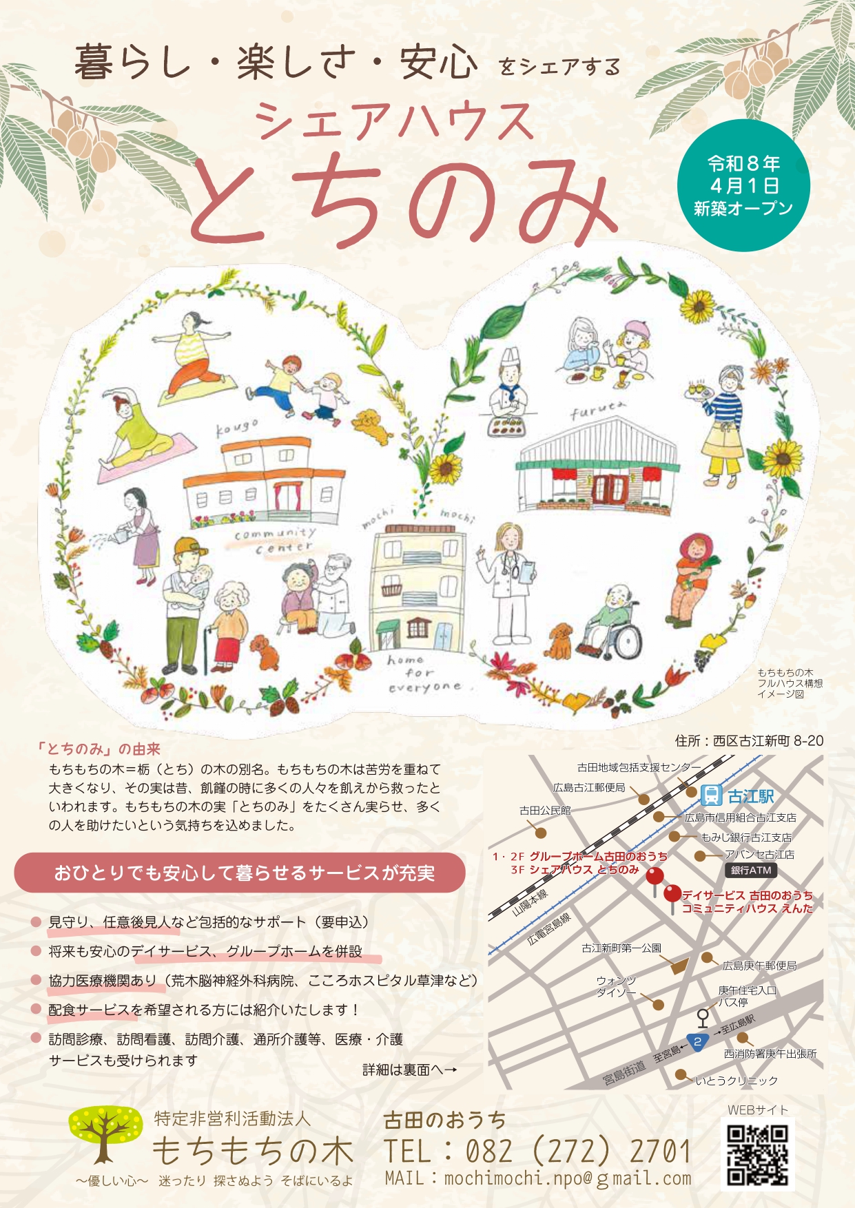 入居お申込み、お問い合わせはお気軽に・・・特定非営利活動法人もちもちの木 TEL082-272-2701(丸谷)